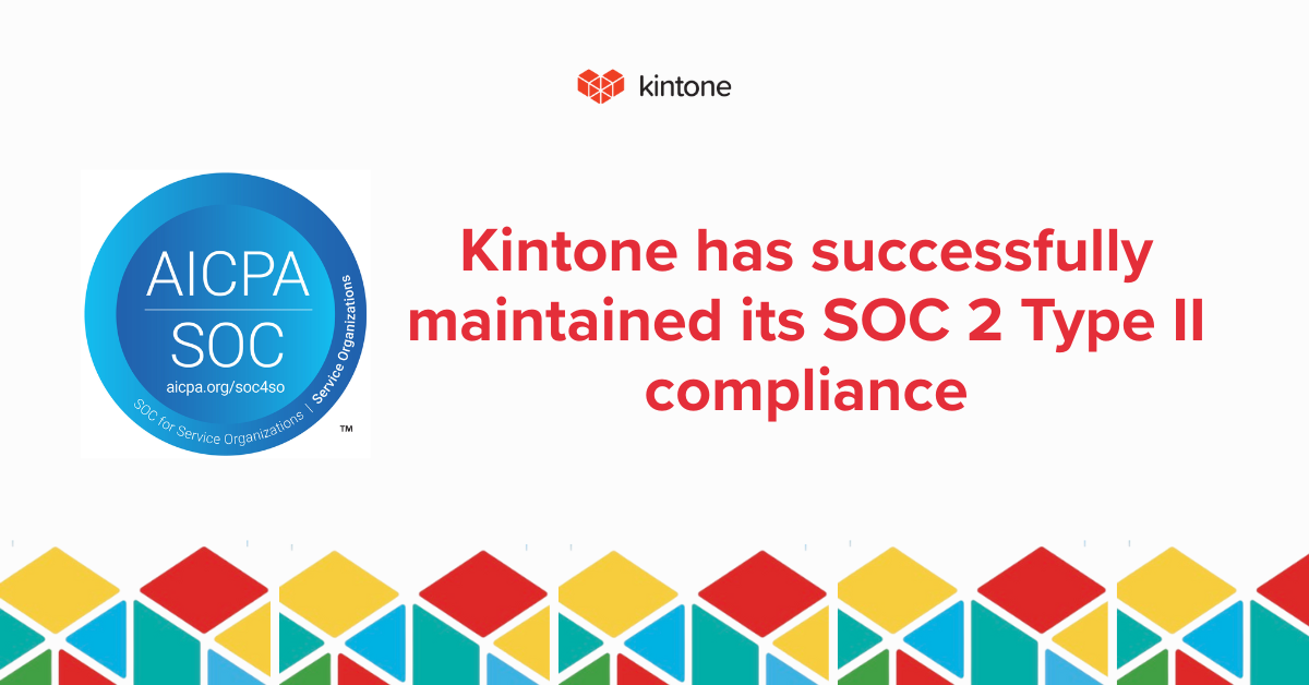 Kintone maintained its SOC 2 Type II compliance following an independent audit that verified the effectiveness of its controls for security, availability, processing integrity, confidentiality, and privacy. This ongoing compliance demonstrates Kintone's commitment to providing a secure environment where teams can manage sensitive data.